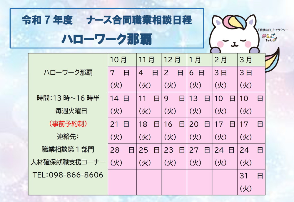 沖縄県ナースセンターの就業相談推進アドバイザー(看護職員)がハローワークに出張して無料で相談に応じます。