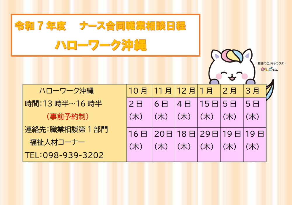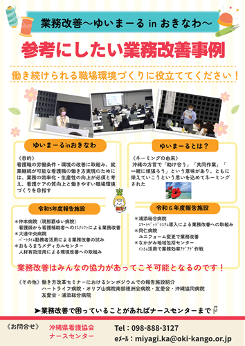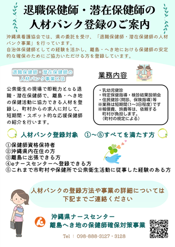 | 相談窓口・お問い合わせ先 | 沖縄県ナースセンター TEL:098-888-3127・3128 はたらくナースの相談窓口(日本看護協会) はたらくナースの相談窓口(沖縄県ナースセンター) |